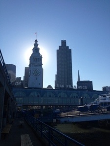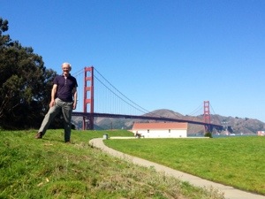 Jake and I walked 17 km today across the Bridge. Cycling is an option and Jake has done this before and I did consider it, but on the day walking the bridge is better. Most people walk it so that on a bike, the path is so congested that one would spend most of the time concentrating on slowing down and/or avoiding the walkers. This detracts from actually enjoying the view which to appreciate in the full one needs to dismount anyway. Solution go for a ride but get off and walk bike across. We walked to Sausalito, a rather touristy sea side village on the other side and had a late lunch. I had calamari which to my surprise was not accompanied by chips, bread, a bun or indeed anything else other than two small dishes of commercial sauces – one red the other white.